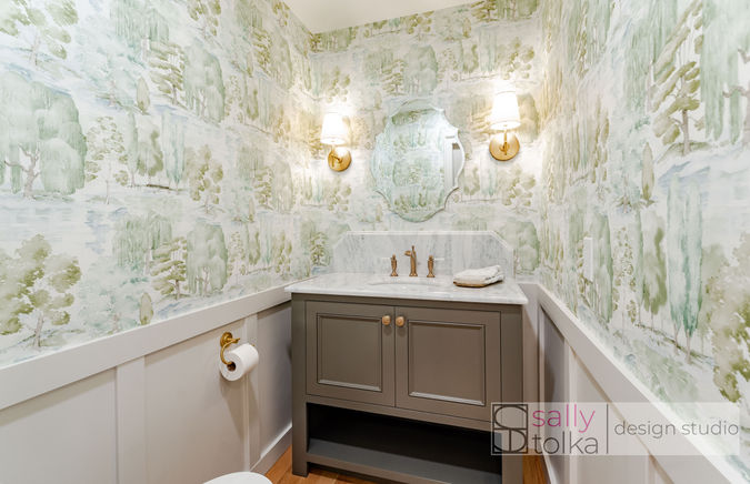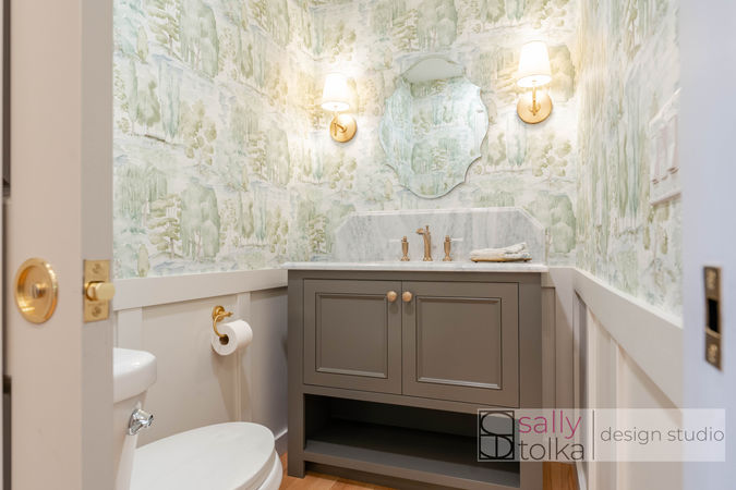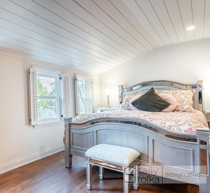 This client had a very clear idea of what her style was. Choosing finishes for her was easy. She had an exisiting bedroom suit of mirrored furniture that she wanted to use and she loved all things ornate. I wanted to make lasting changes to the home. I started by adding apporpriate mill work which was non existant. We added solid core painted doors and adorned them with new crystal and brass door knobs. Existing glass door knobs were found throughout the home and were commonly used at the time of this home being built. We added hardwood flooring to the bedroom and vestibule and tile to the bathroom and laundry room. The bathroom I kept it classic by using white and black but for the tile I used a matte finish. The vanity is custom made to maximize the function. We put the shower in the dormer and had enough room for a freestanding bathtub. I tucked built-in closets into the eaves of the attic bedroom and I added a walk-in closet at the entry of the bedroom. My favorite thing might be the coat closet in the vestibule. I wanted it to look like an armoire shoved into the wall. It has a relationship with the ajoining room that isn't picture but is full of oak wainscott paneling and oak beams. Everything that we created made this house cohesive and appropriate. The one departure might be in the guest bathroom upstairs. It had exisiting harvest gold fixtures. I decided to keep them and update everything else. The result is fun and quirky, all perfect things for a guest bathroom.